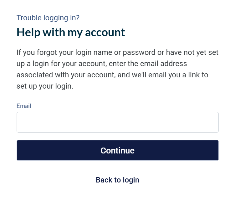 - This will take you to a page titled “Help with my account.” This page is the place to be even if you haven’t yet set up your username and password. You must enter the email contact you provided when you joined. If you are not sure what email address is on your account, or you have not yet provided an email address, please contact the national office by email at [email protected] or by calling 937-438-0085.